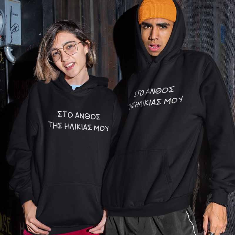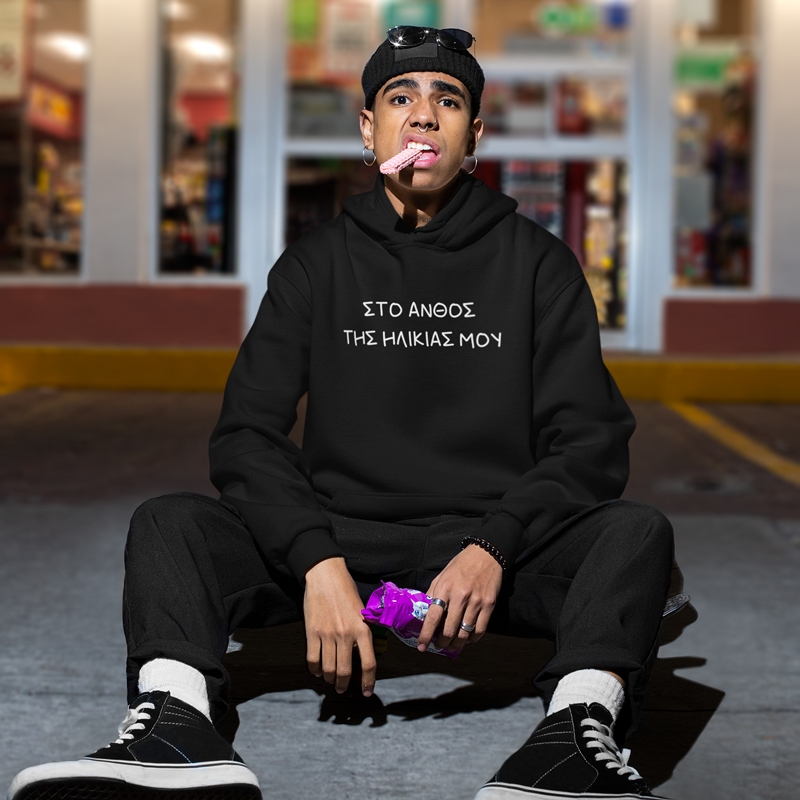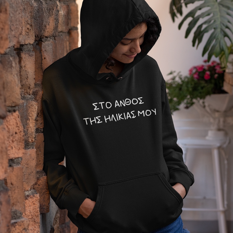 Unisex hoodie σε μαύρη απόχρωση με μήνυμα «Στο άνθος της ηλικίας μου».