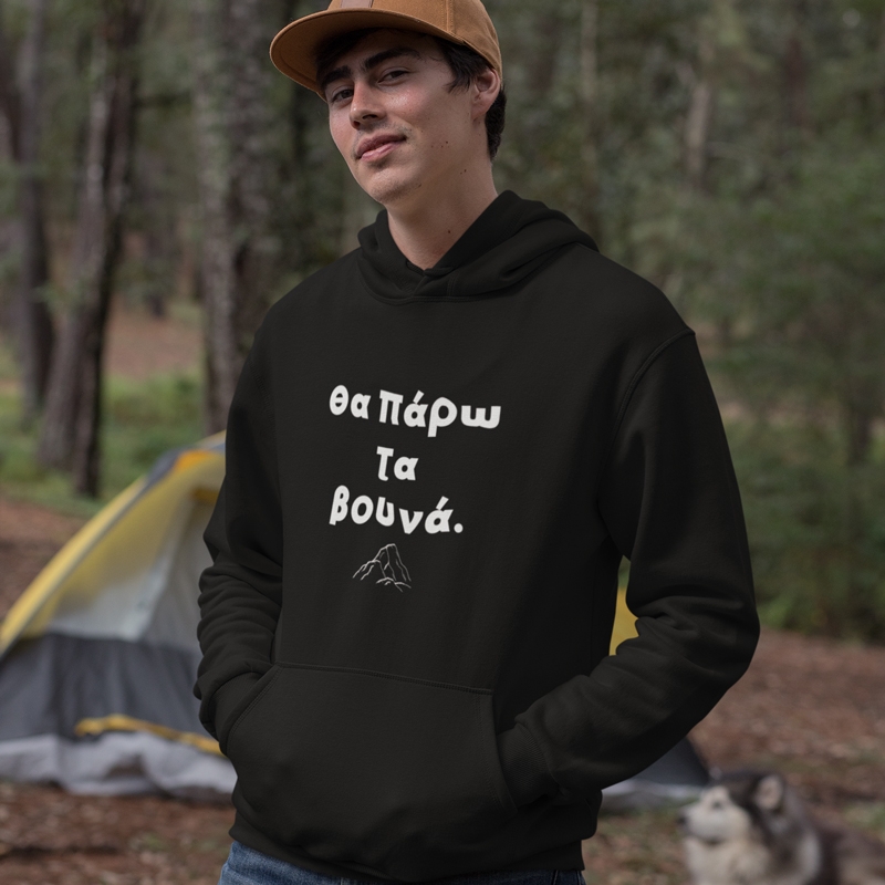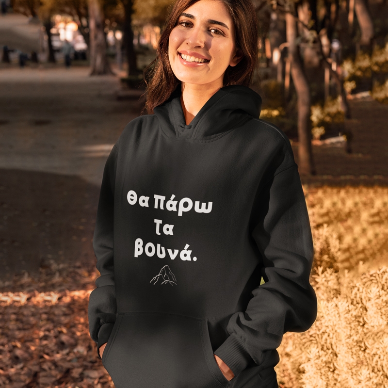 Unisex hoodie σε μαύρη απόχρωση με μήνυμα «Θα πάρω τα βουνά».