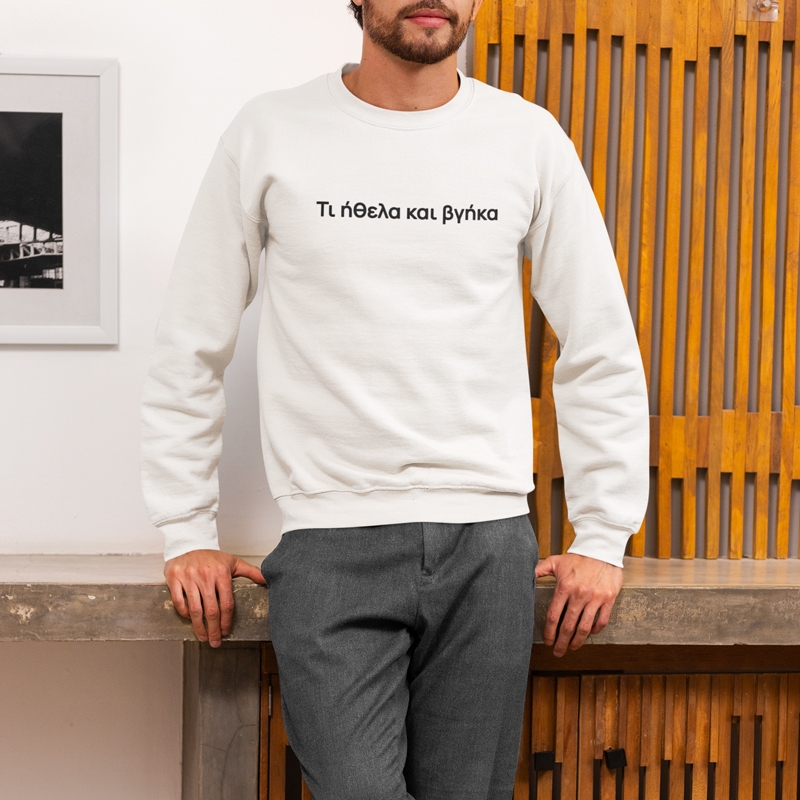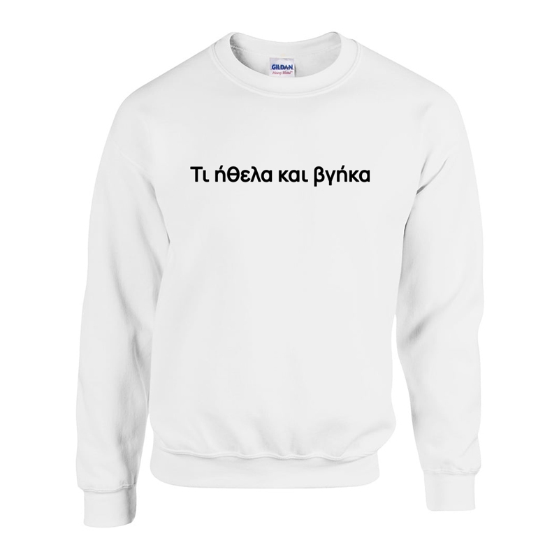 Unisex φούτερ crewneck σε λευκή απόχρωση με μήνυμα «Τι ήθελα και βγήκα».
