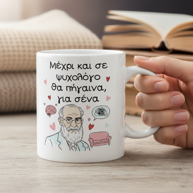 Πρωτότυπη κούπα με αστείο μήνυμα «Μέχρι και σε ψυχολόγο θα πήγαινα, για σένα». Ιδανική επιλογή για να δηλώσετε μέχρι πού θα φτάνατε για την αγάπη.