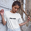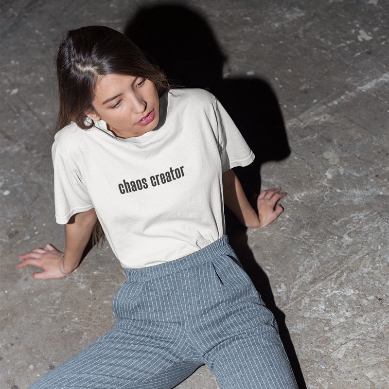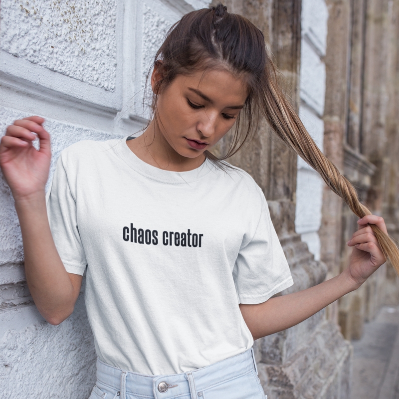 Γυναικείο βαμβακερό κοντομάνικο μπλουζάκι σε λευκή απόχρωση με μήνυμα «chaos creator».