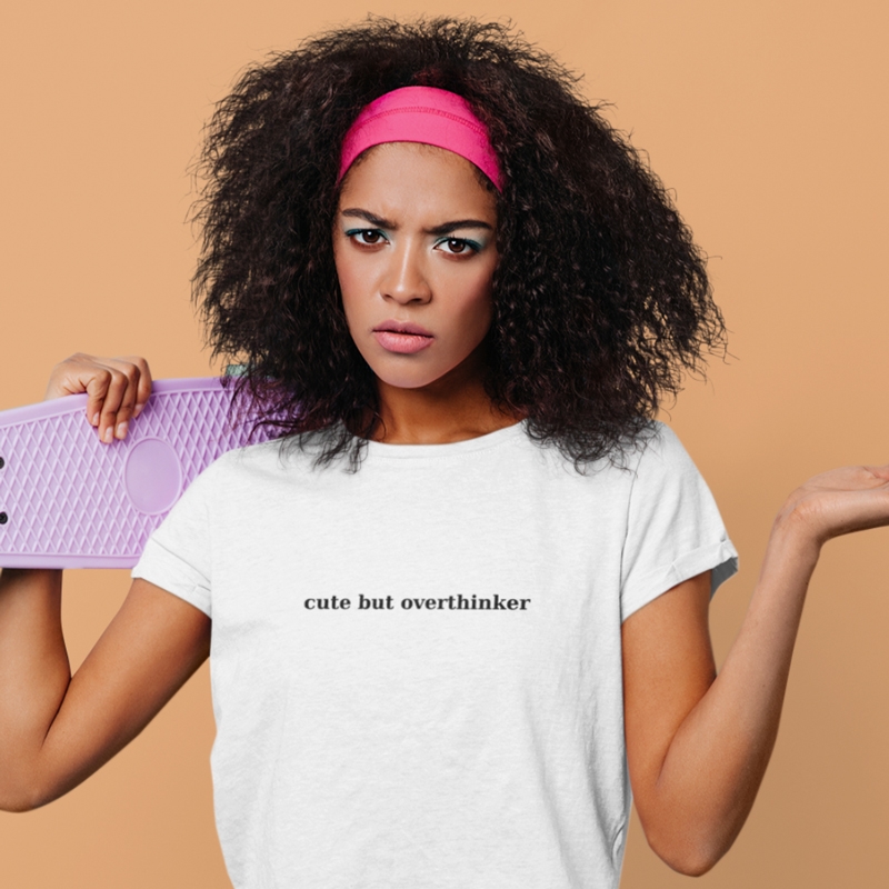 Γυναικείο βαμβακερό κοντομάνικο μπλουζάκι σε λευκή απόχρωση με μήνυμα «Cute but overthinker».