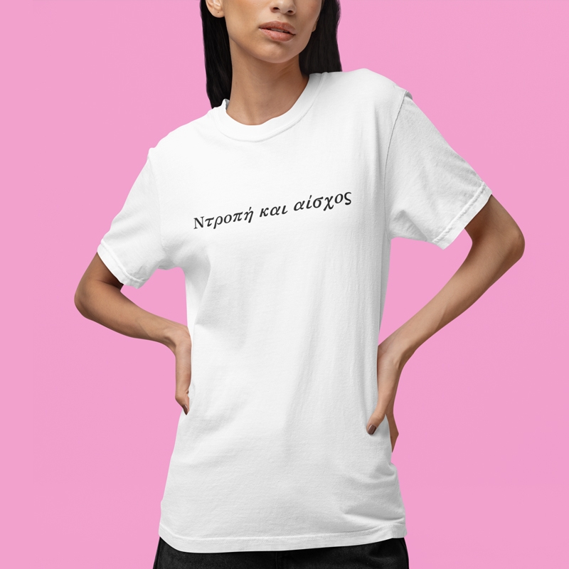 Γυναικείο βαμβακερό κοντομάνικο μπλουζάκι σε λευκή απόχρωση με μήνυμα «Ντροπή και αίσχος».