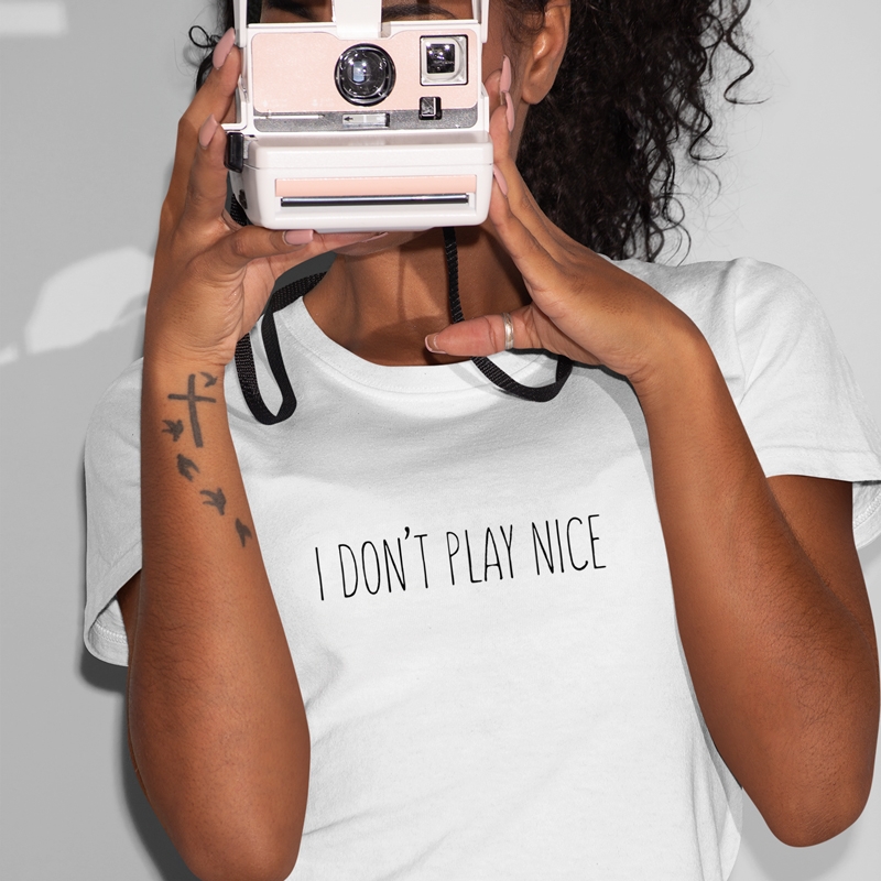Γυναικείο βαμβακερό κοντομάνικο μπλουζάκι σε λευκή απόχρωση με μήνυμα «I don't play nice».