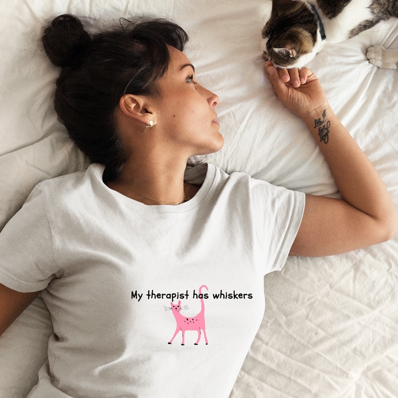 Γυναικείο βαμβακερό κοντομάνικο μπλουζάκι σε λευκή απόχρωση με μήνυμα «My therapist has whiskers».