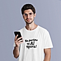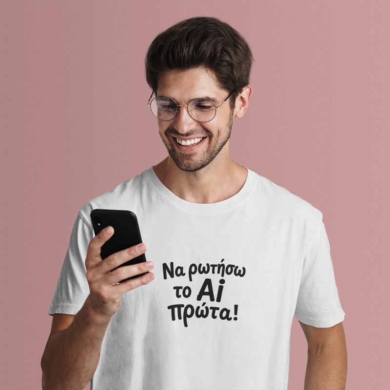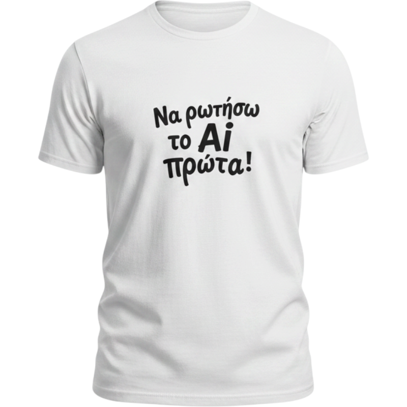 Ανδρικό βαμβακερό κοντομάνικο μπλουζάκι σε λευκή απόχρωση με μήνυμα «Να ρωτήσω το Ai πρώτα».