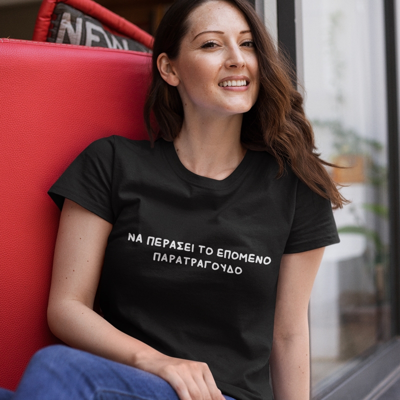 Γυναικείο βαμβακερό κοντομάνικο μπλουζάκι σε μαύρη απόχρωση με μήνυμα «Να περάσει το επόμενο παρατράγουδο».