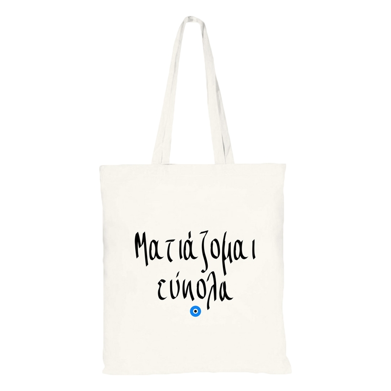 Tote bag με μήνυμα που «Ματιάζομαι εύκολα». Ειδικά σχεδιασμένη για εσένα που είσαι επιρρεπής στα φθονερά βλέμματα.