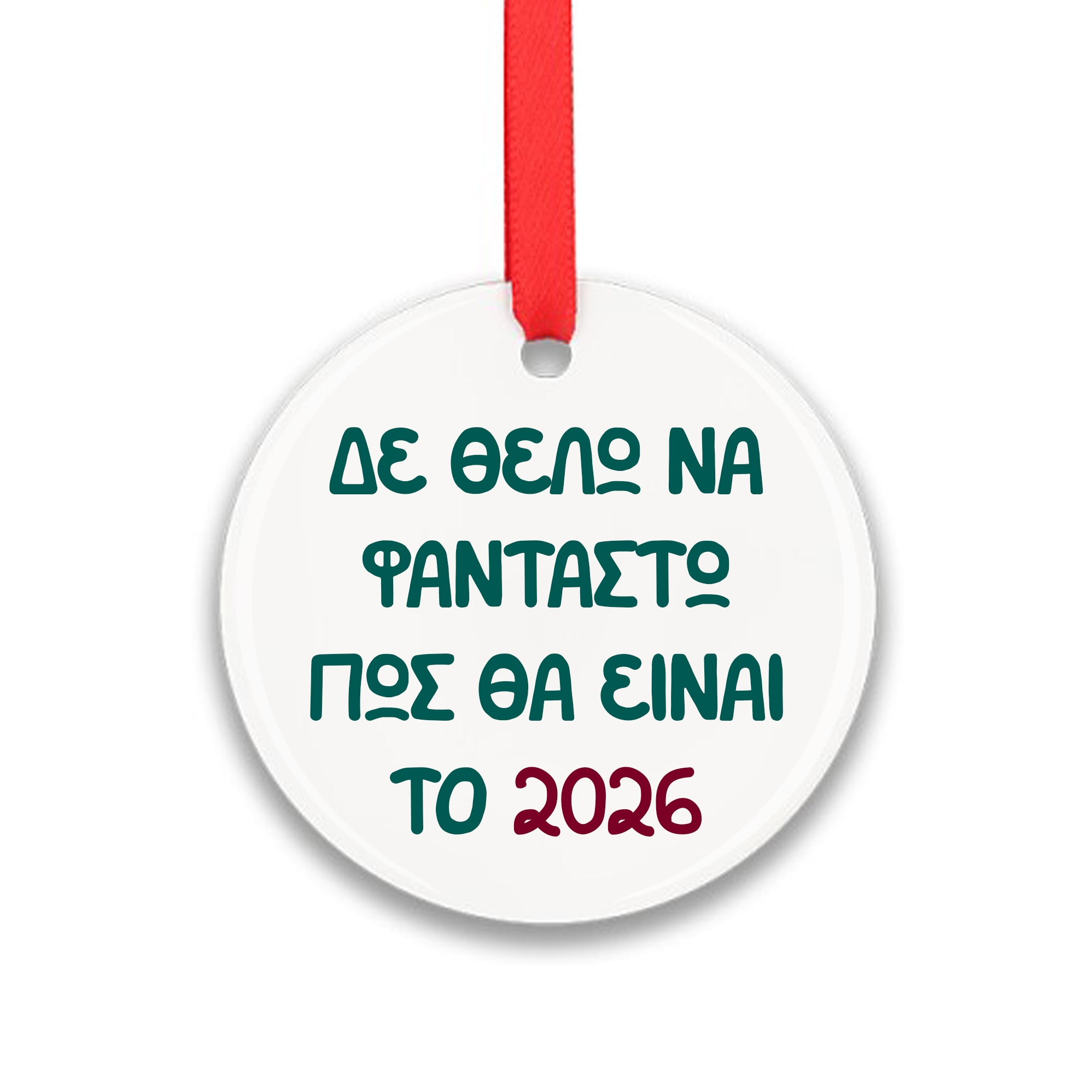 Χριστουγεννιάτικο μεταλλικό στολίδι “Δε θέλω να φανταστώ πώς θα είναι το 2026” – γιατί ας είμαστε ειλικρινείς… κανείς δε θέλει! Ιδανικό για στολισμό με χιούμορ και γιορτινή υπαρξιακή αγωνία.